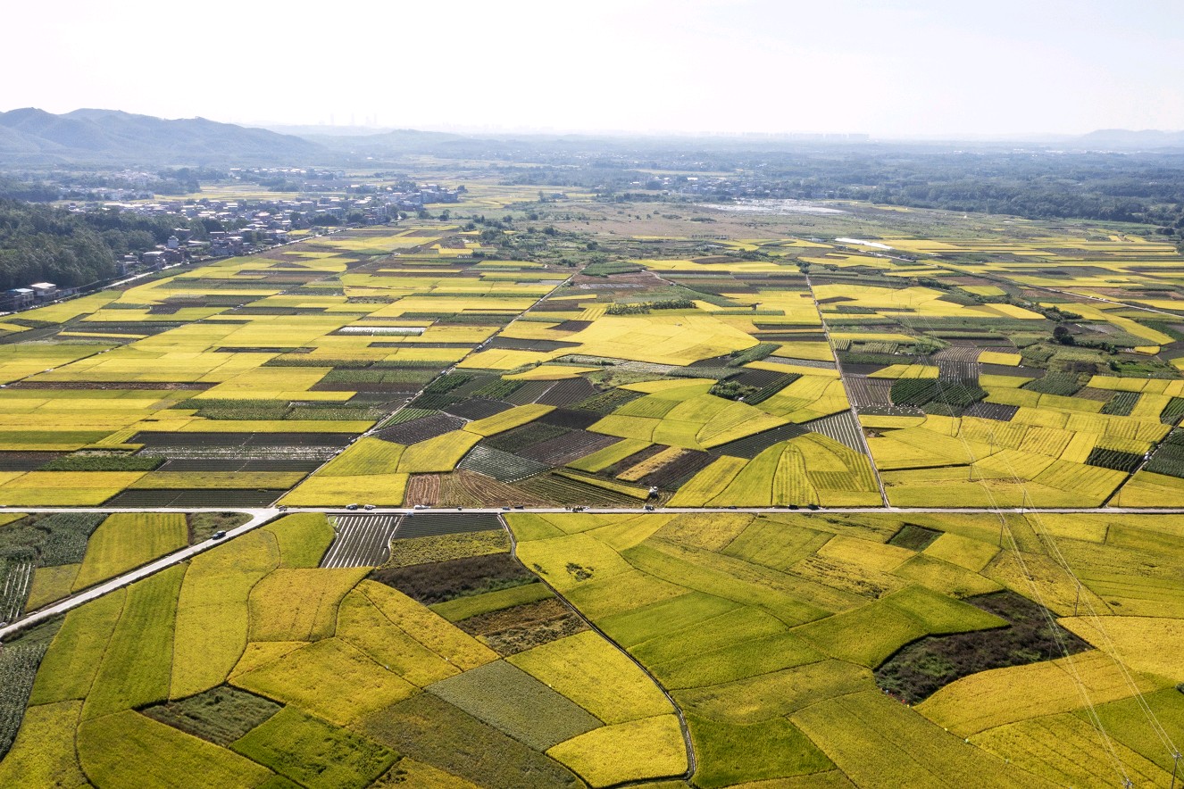 2024年10月23日,在广西南宁市兴宁区五塘镇沙平村,一列动车在色彩斑斓的田野上飞驰而过。2024年10月23日在广西南宁市兴宁区五塘镇沙平村拍摄的田园景色。深秋时节,广西南宁市兴宁区五塘镇沙平村广袤的田野,成熟的稻田一片金黄,与村落、村道相互映衬,构成一幅色彩斑斓的田园画卷。 金秋 深秋 田野 田园 稻田 动车
