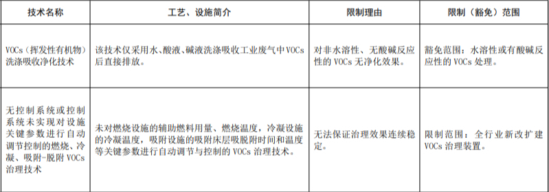 今年 3 月,国务院印发《推动大规模设备更新和消费品以旧换新行动方案》,提出推进重点行业设备更新改造,依法依规淘汰不达标设备。9月,生态环境部发布了《国家污染防治技术指导目录(2024年,限制类和淘汰类)》(公示稿),涉及vocs治理的限制类技术有两类,淘汰类技术有三类(下图)。