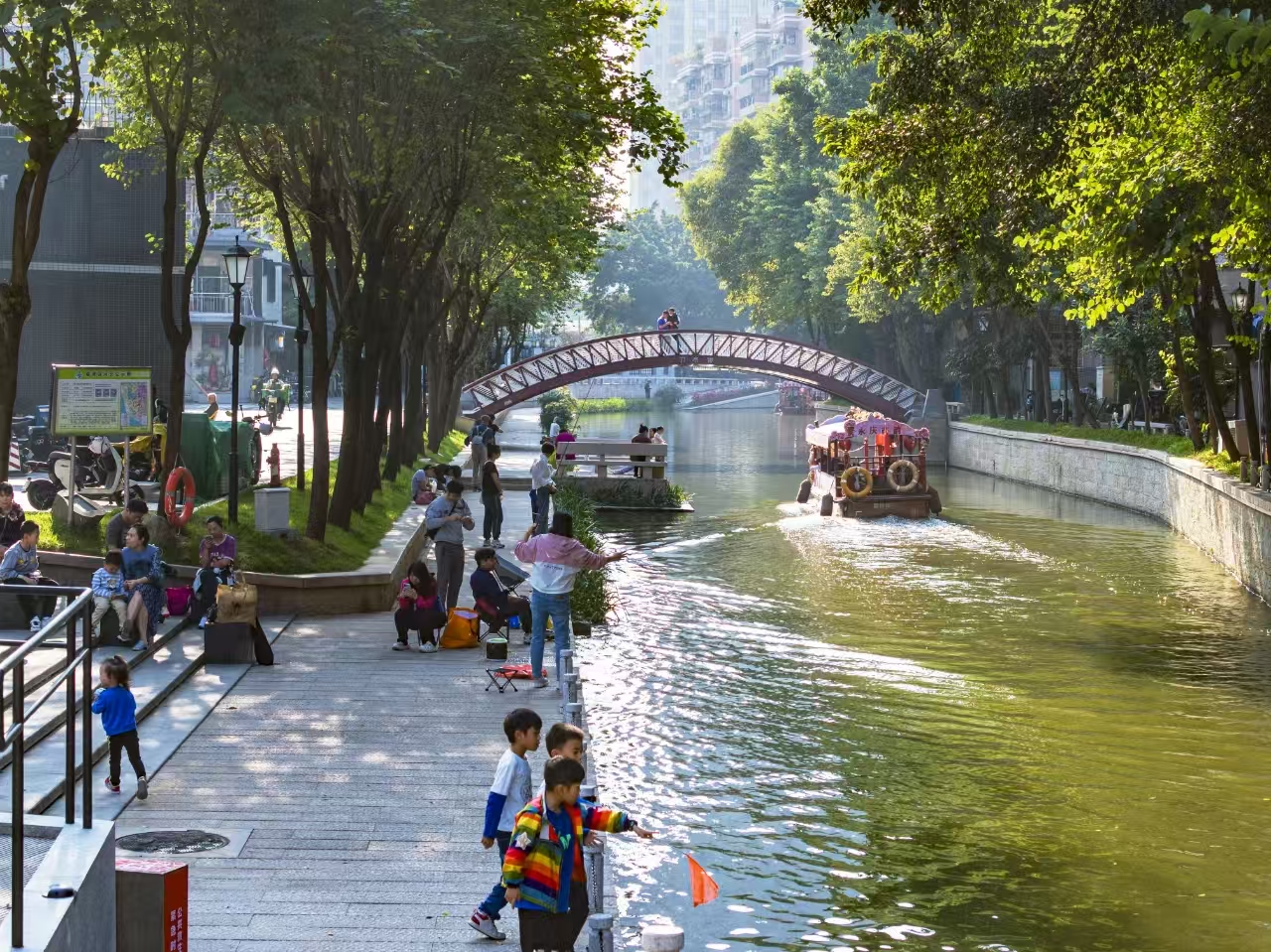 荔枝湾涌美丽河湖建设中注重挖掘水文化内涵,让传统与现代在滨水空间交融共生。在永庆坊的骑楼街巷间,广彩、粤剧、醒狮在年轻匠人手中焕发新生;游客可体验广彩绘制、岭南灰塑等传统技艺,乘花船,听广府故事,感受老西关的浪漫。