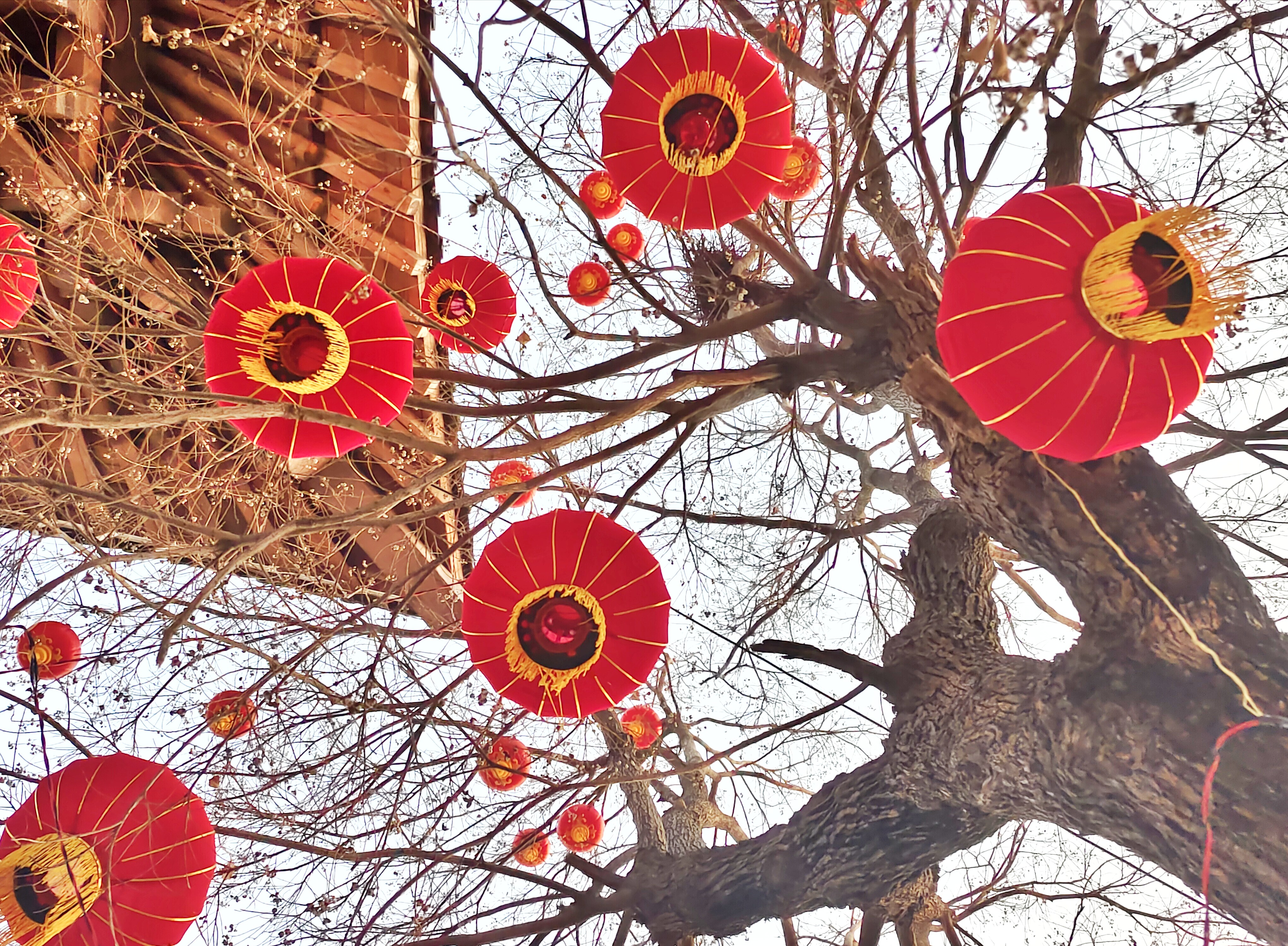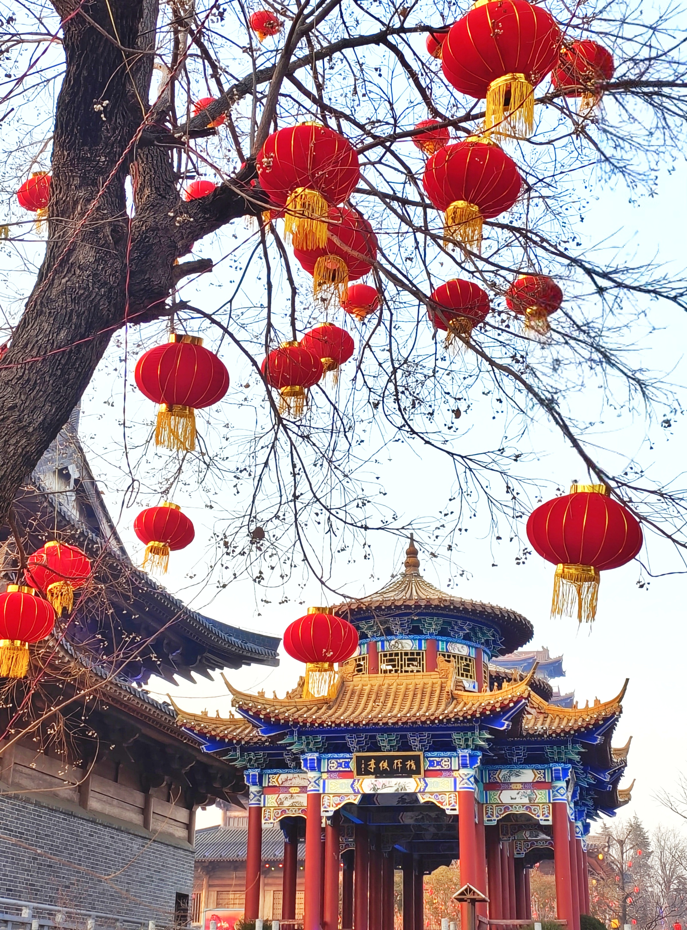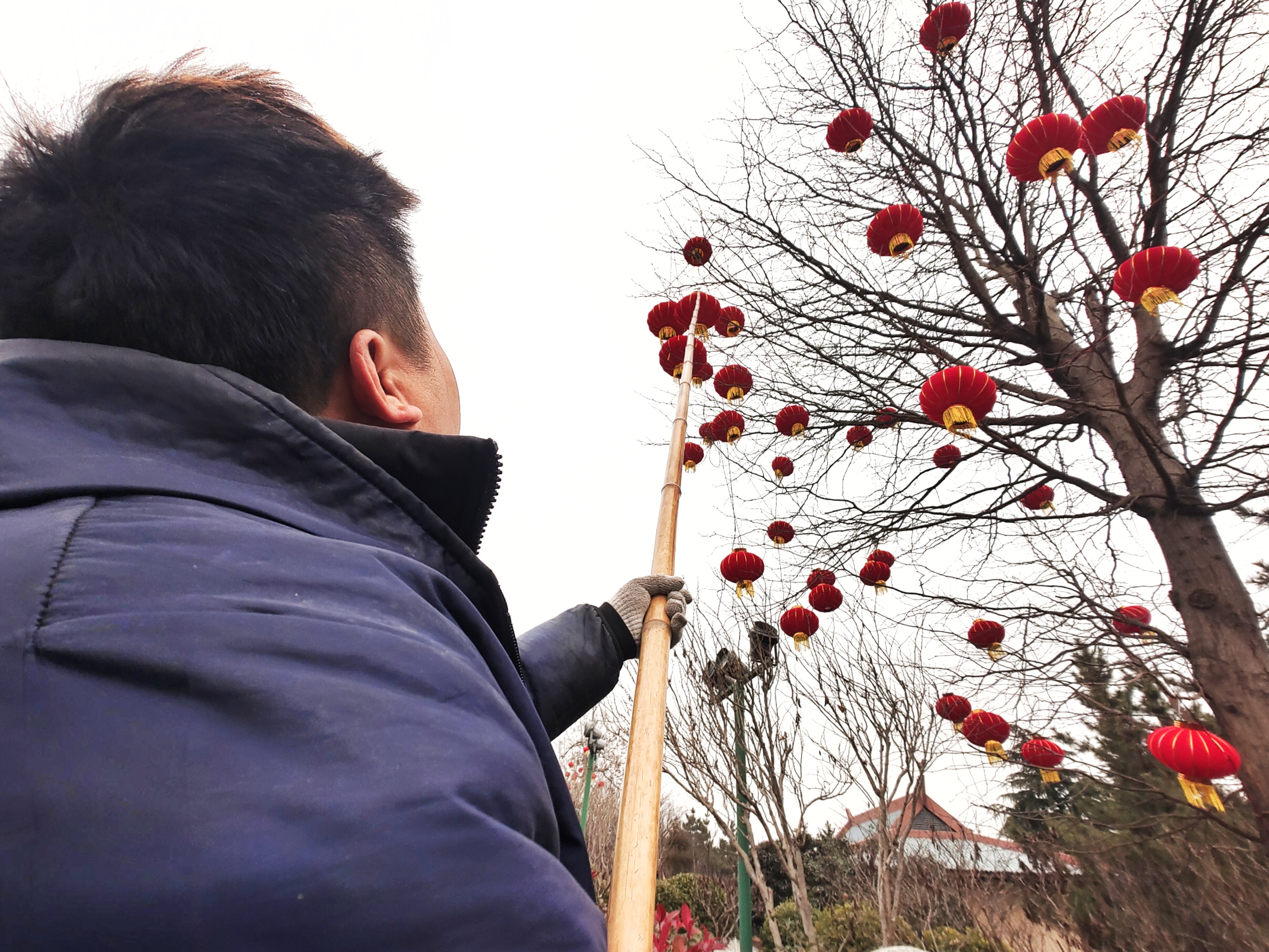 1月28日,春节越来越近,临沂东夷文化园内的树木上,挂起了喜迎新春的大大小小的红灯笼,犹如一个个红红彤彤的小太阳,为寒冷的冬日增添了一抹暖色。