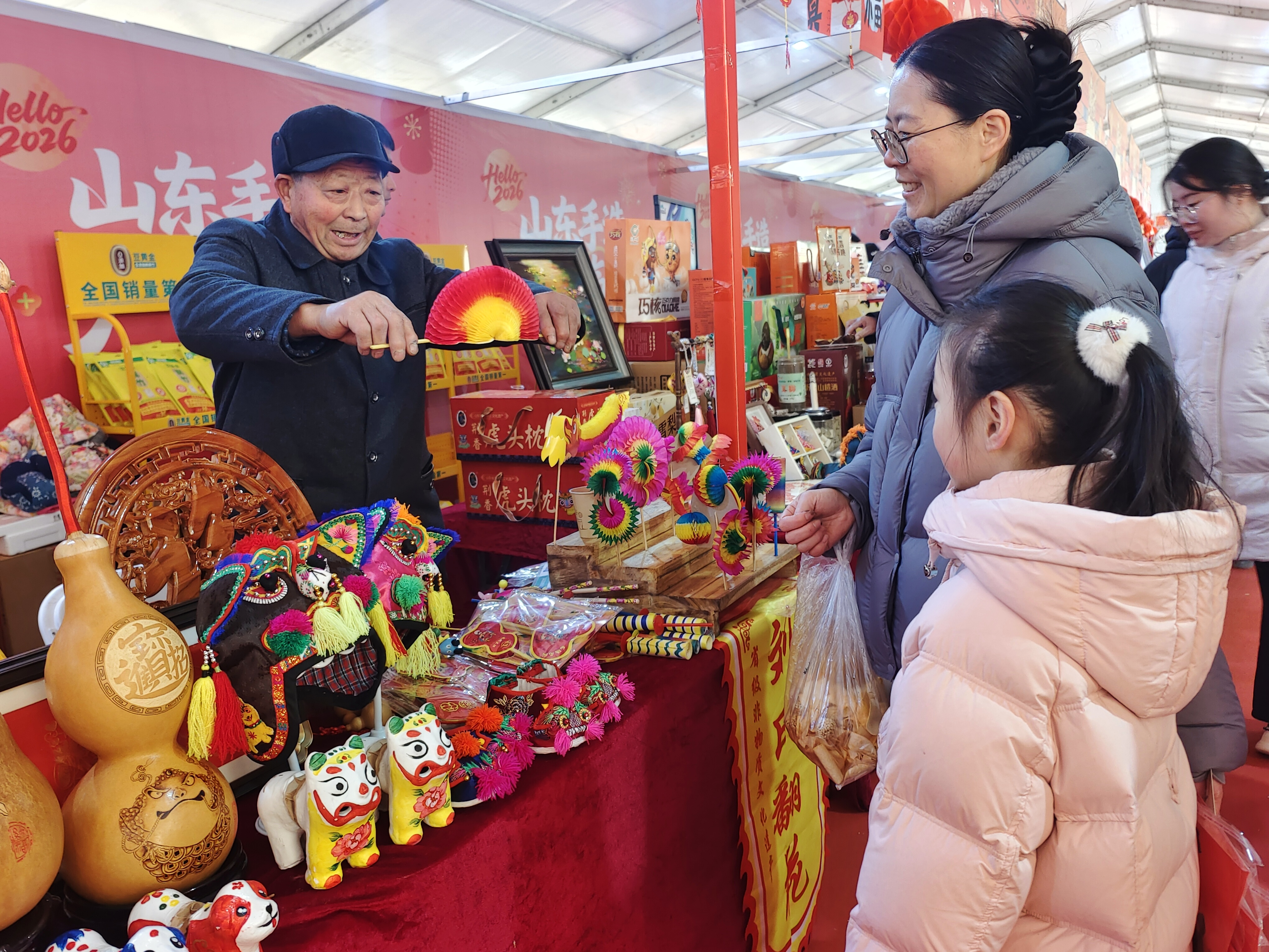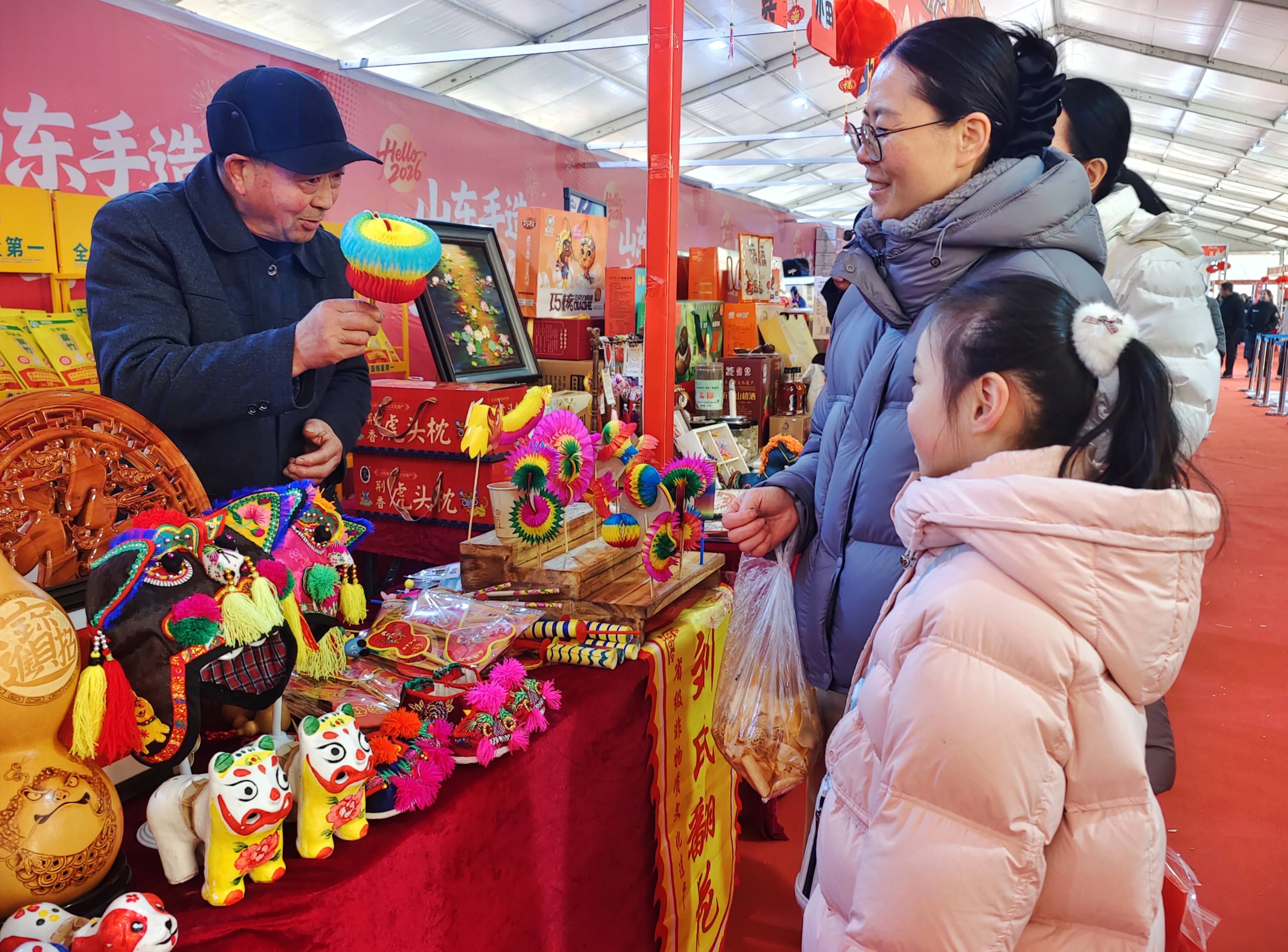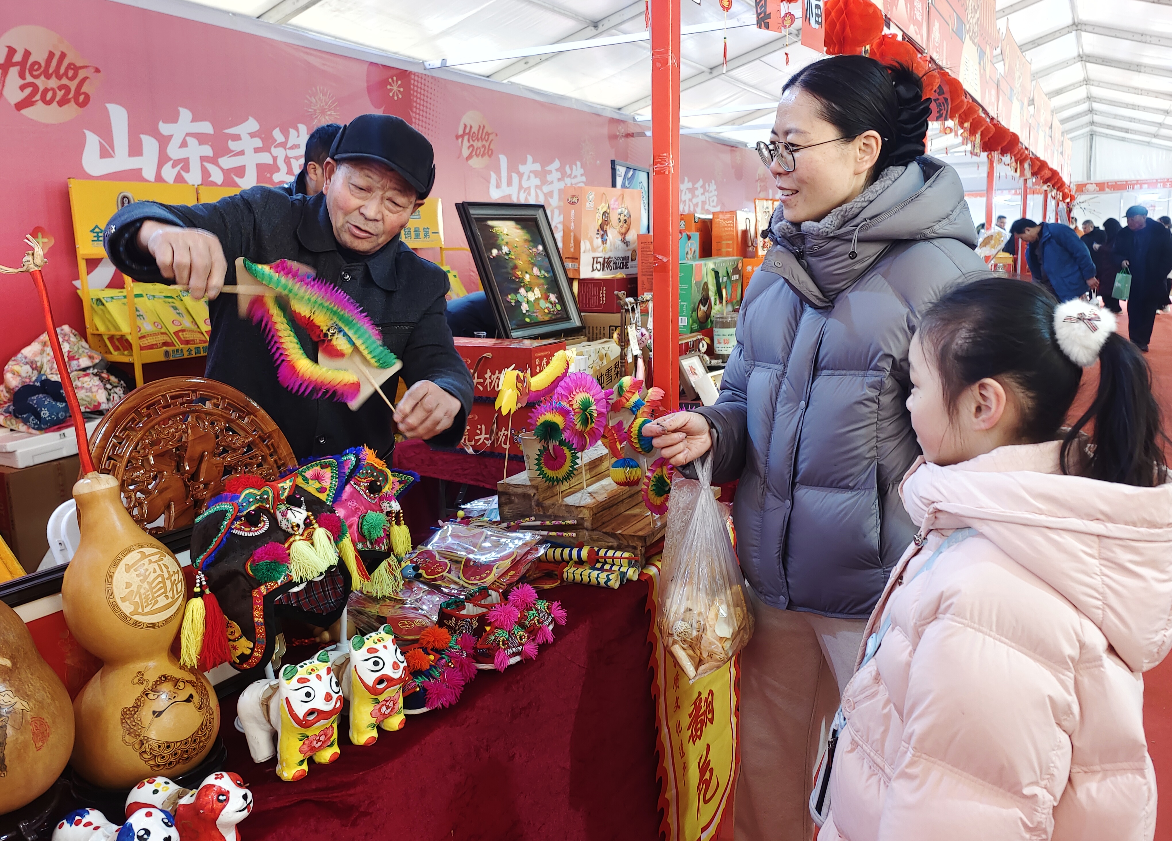 1月30日,“光影沂蒙·奇幻琅琊”数字文化体验月暨“黄河大集”新春季活动在临沂人民广场举行。步入集市摊点,一对母女被奇妙多变的刘氏“翻花”深深吸引。
