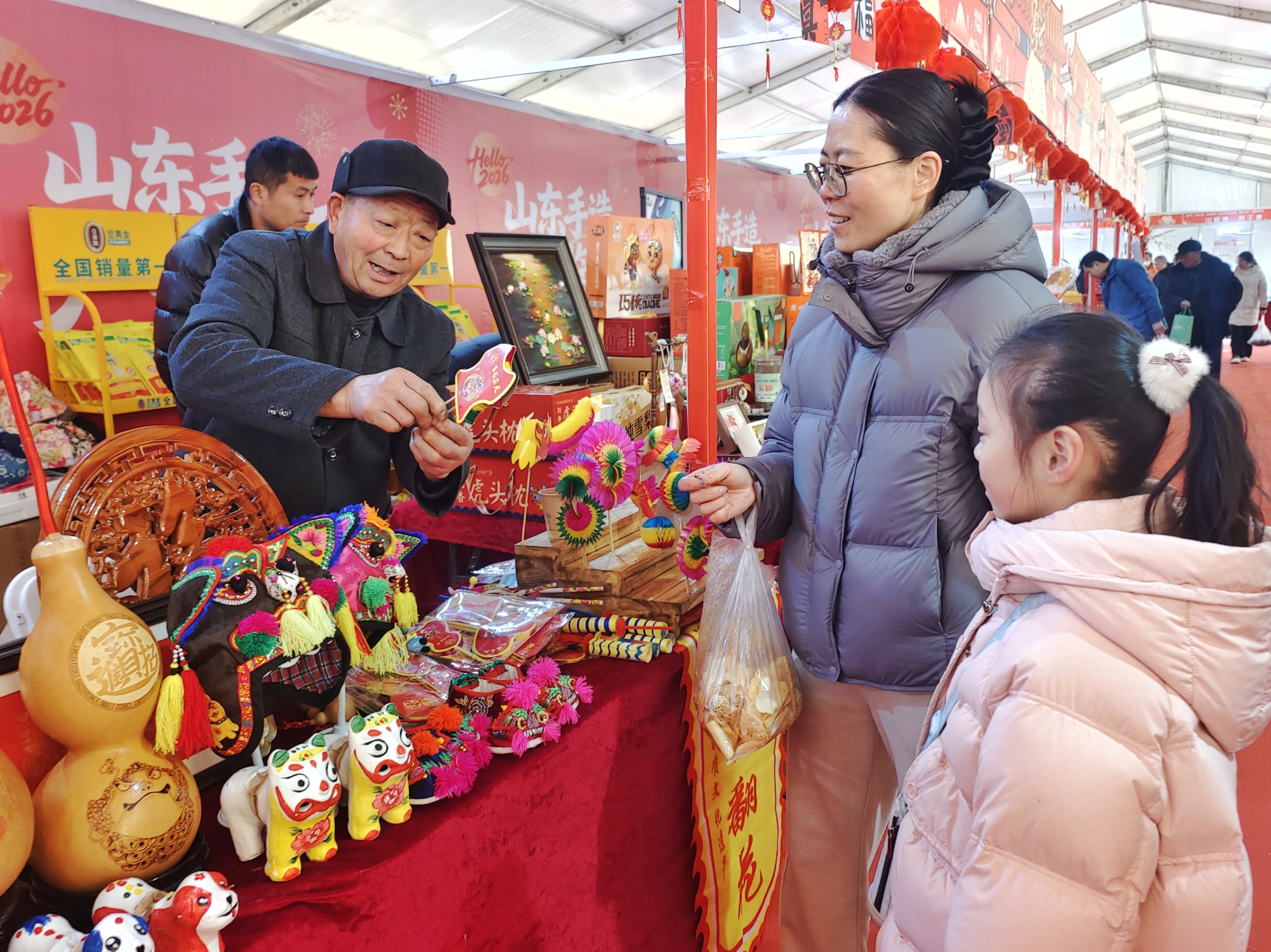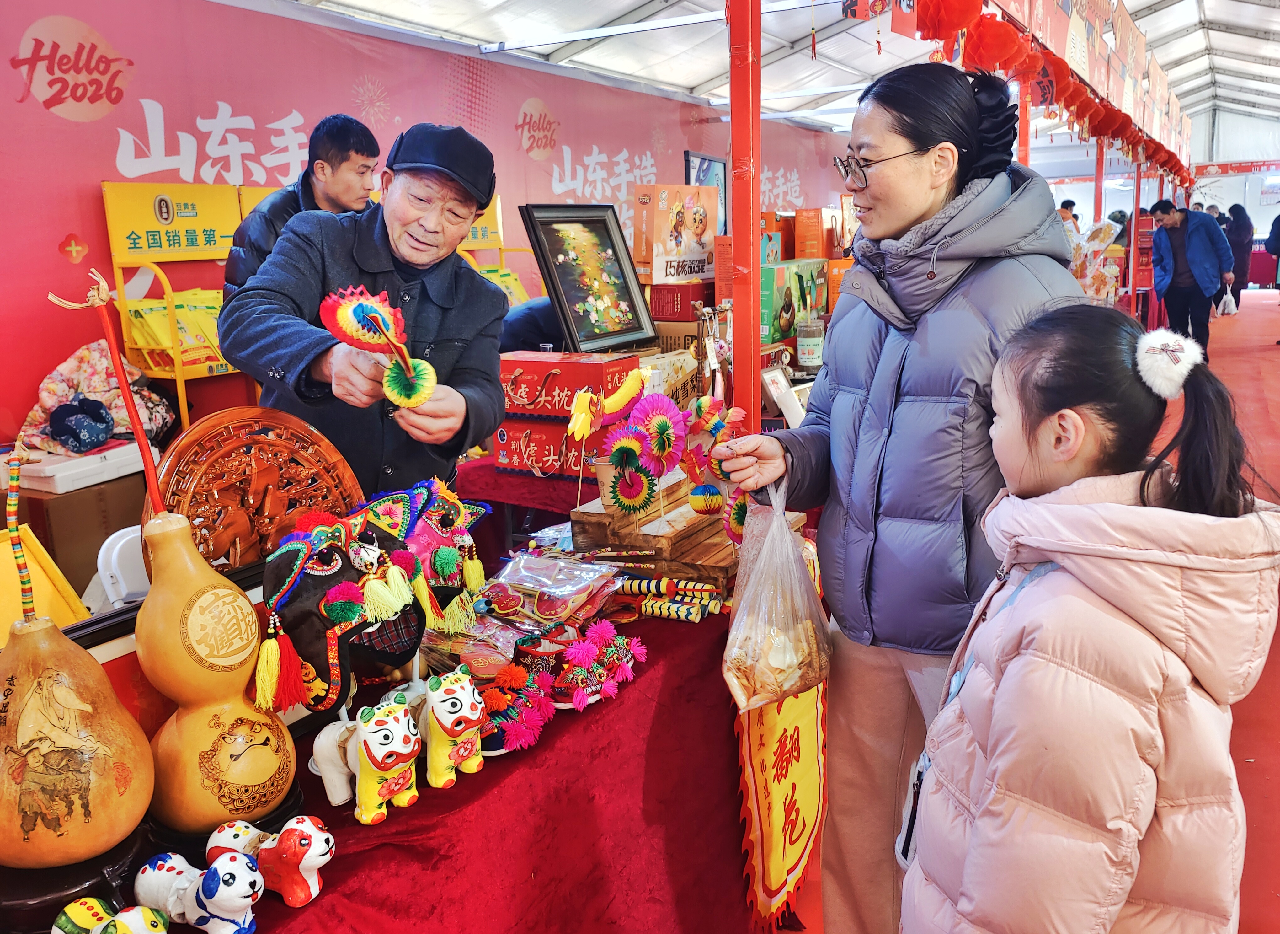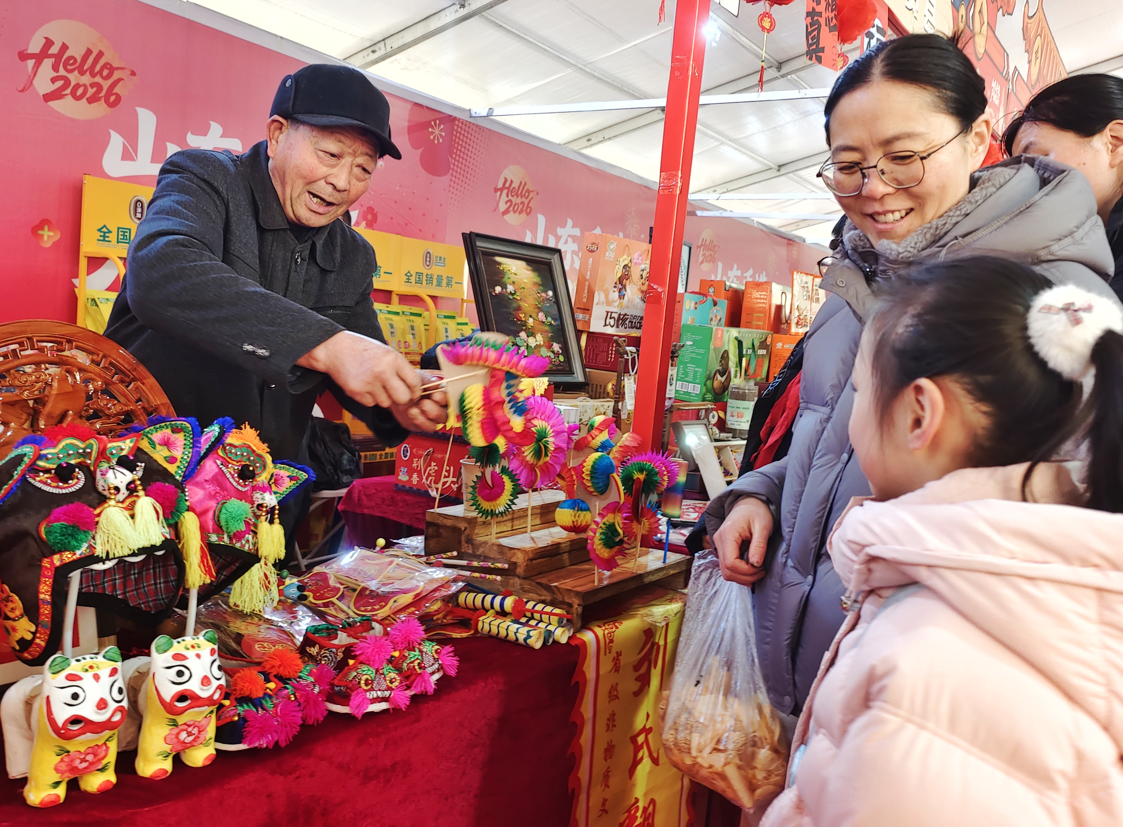 1月30日,“光影沂蒙·奇幻琅琊”数字文化体验月暨“黄河大集”新春季活动在临沂人民广场举行。步入集市摊点,一对母女被奇妙多变的刘氏“翻花”深深吸引。