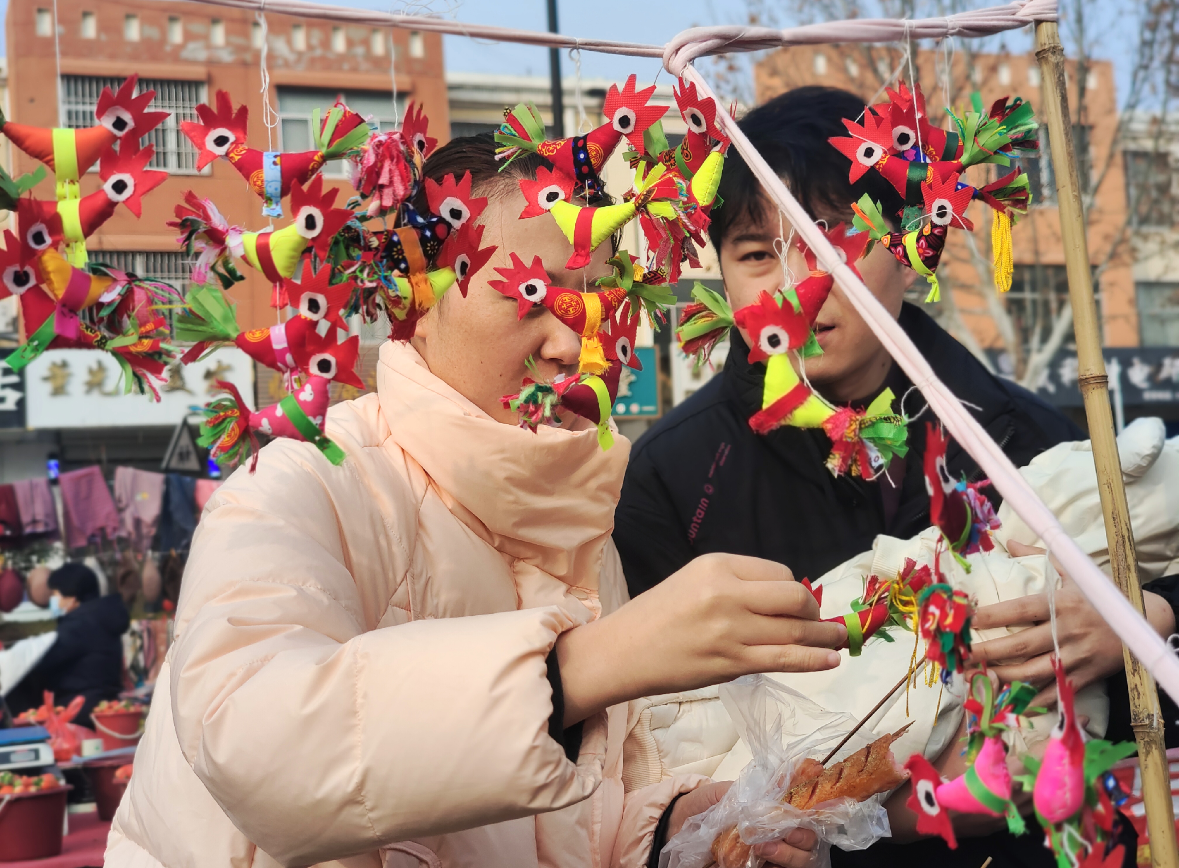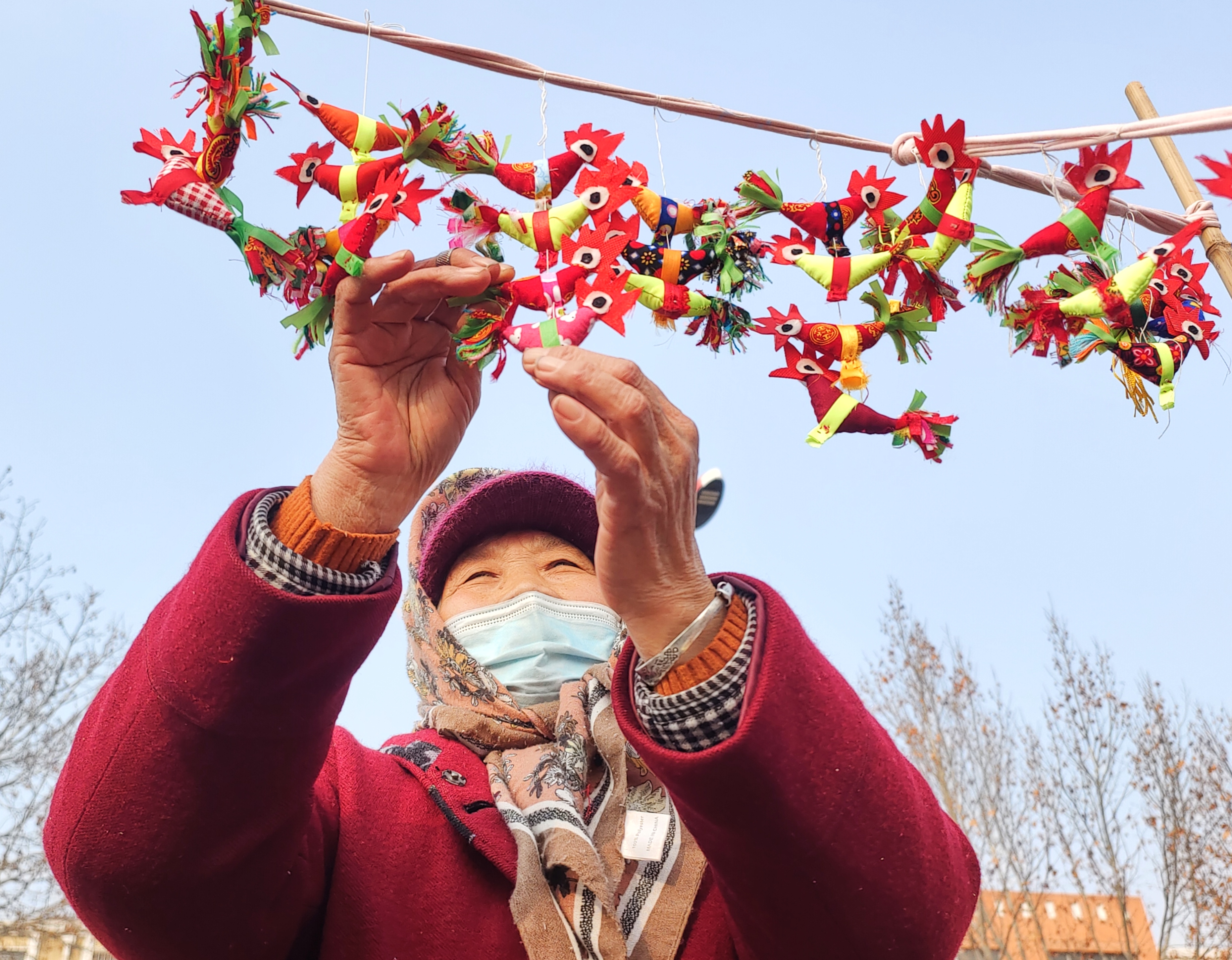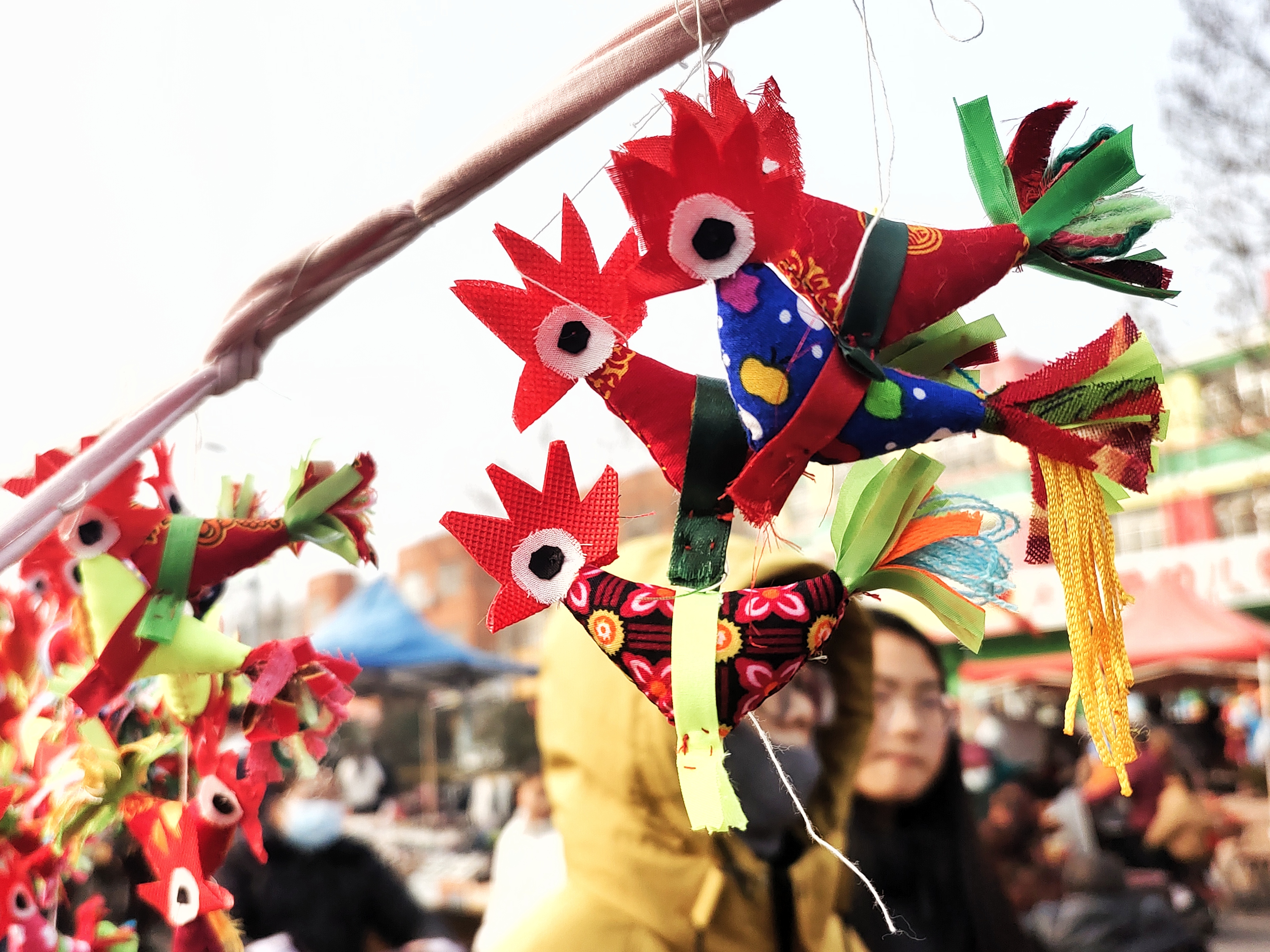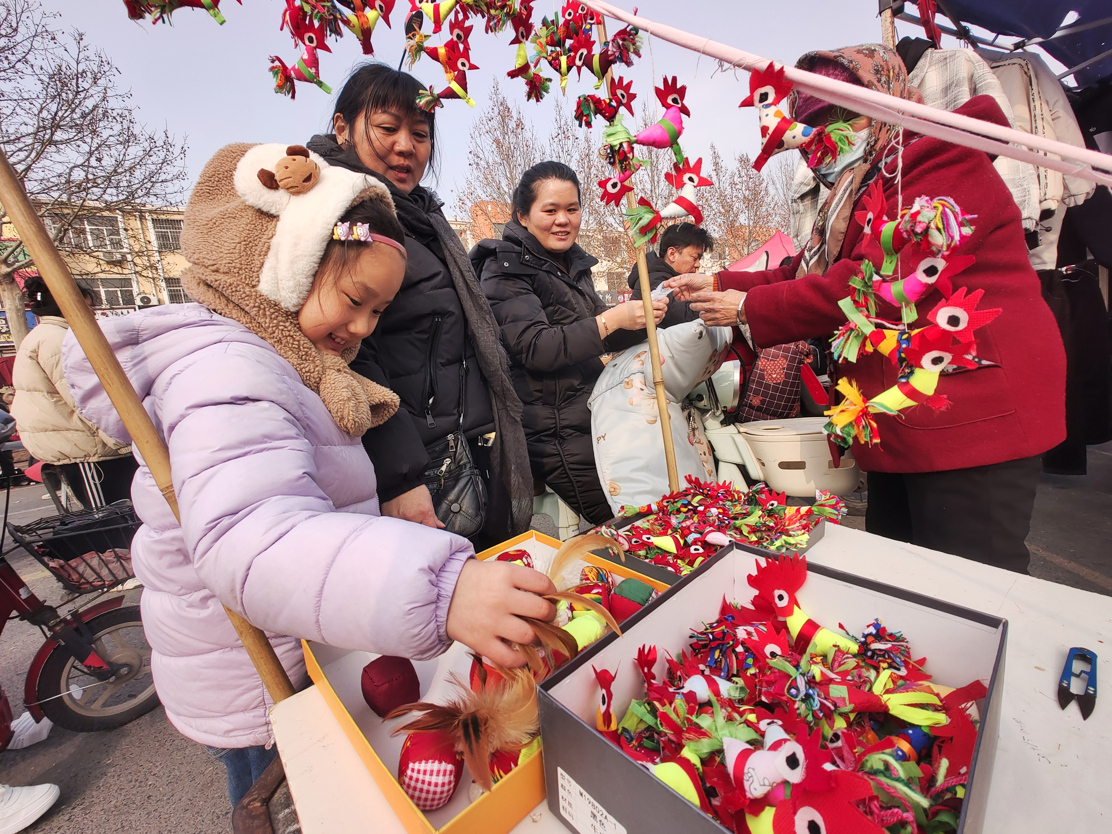 2月1日,农历腊月十四,立春前夕,临沂沂河新区埠前店迎来年中大集,集市上售卖“迎春鸡”的摊点格外引人注目。鲁南地区农村有立春时给小孩子佩戴“春鸡”的习俗。佩戴“春鸡”能够辟邪除灾、迎祥纳福,寄托着长辈对孩子健康成长的美好期许。集市上,一位埠前店老人骑着三轮车,带着亲手制作的“迎春鸡”赶来赶年集。“迎春鸡”5块钱一对,十分抢手,一会儿就卖出了五对。老人说自己卖“迎春鸡”已有十多年,每年都会缝制一些,赶在立春前出来售卖。这些“迎春鸡”由棉布和棉花组合缝制而成,个个神态活灵活现、栩栩如生。小孩佩戴“迎春鸡”寓意着大吉大利、健康平安。(高军摄影)
