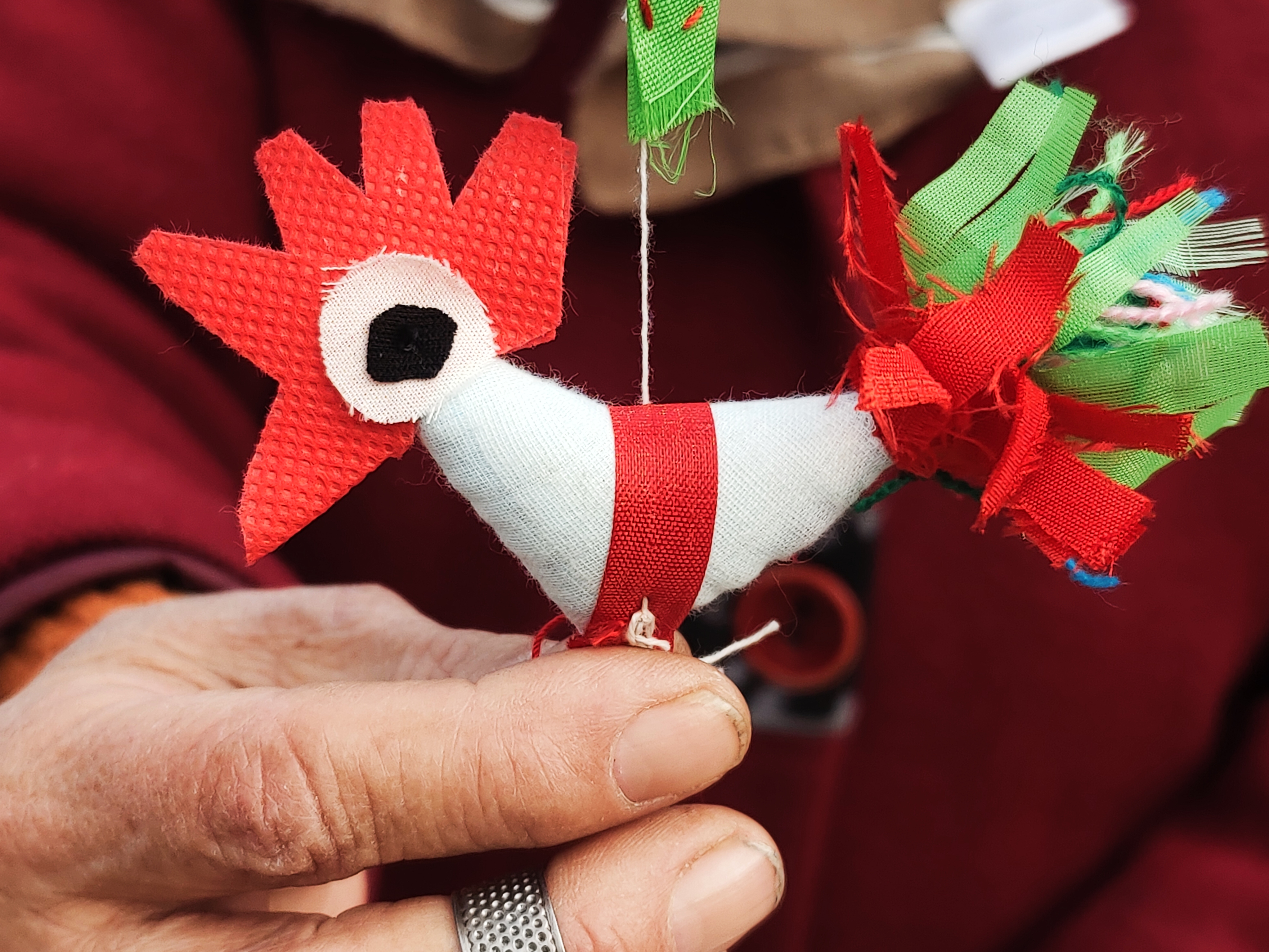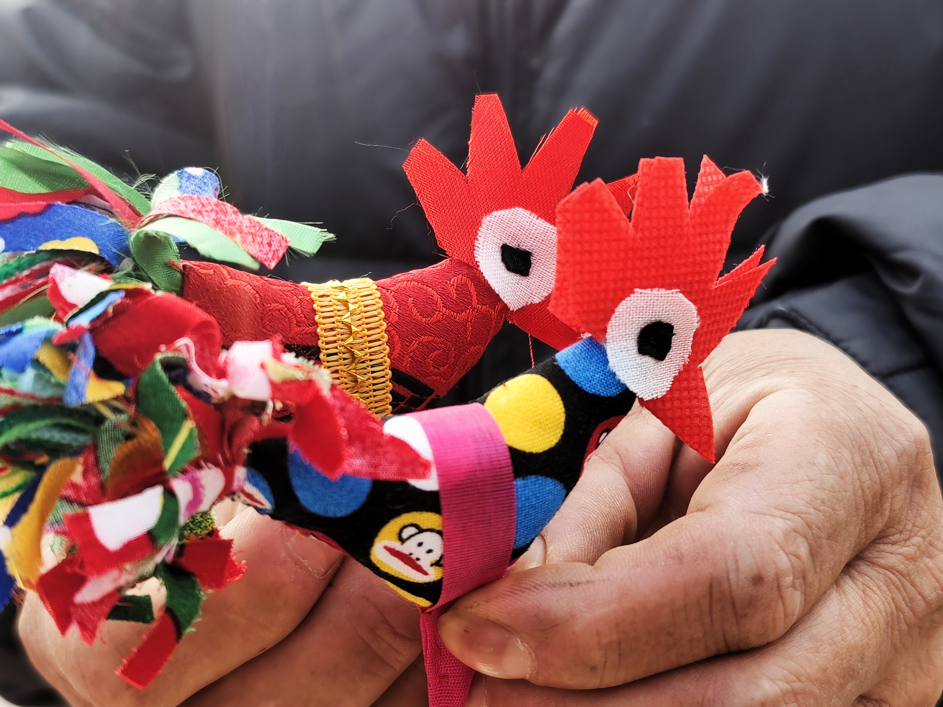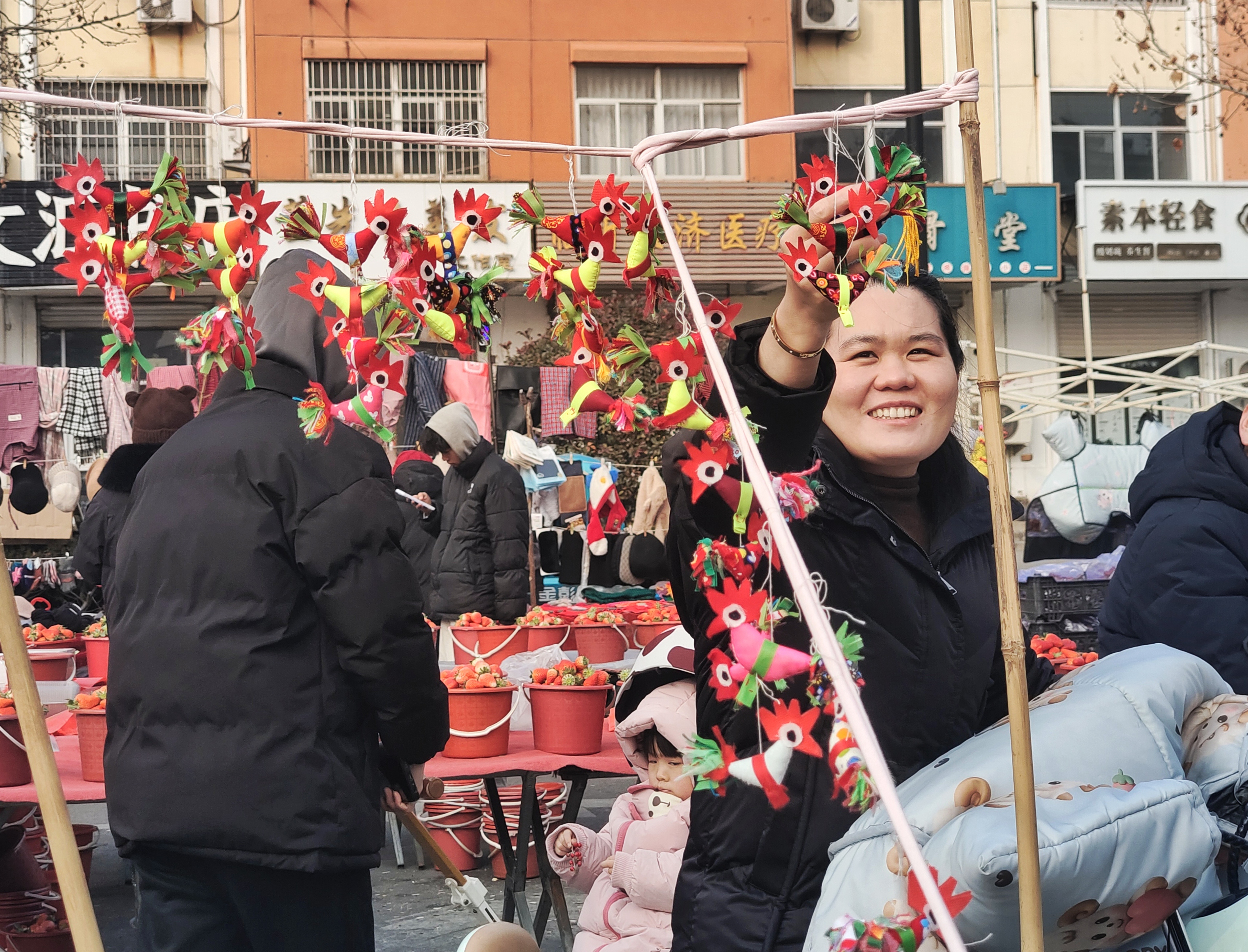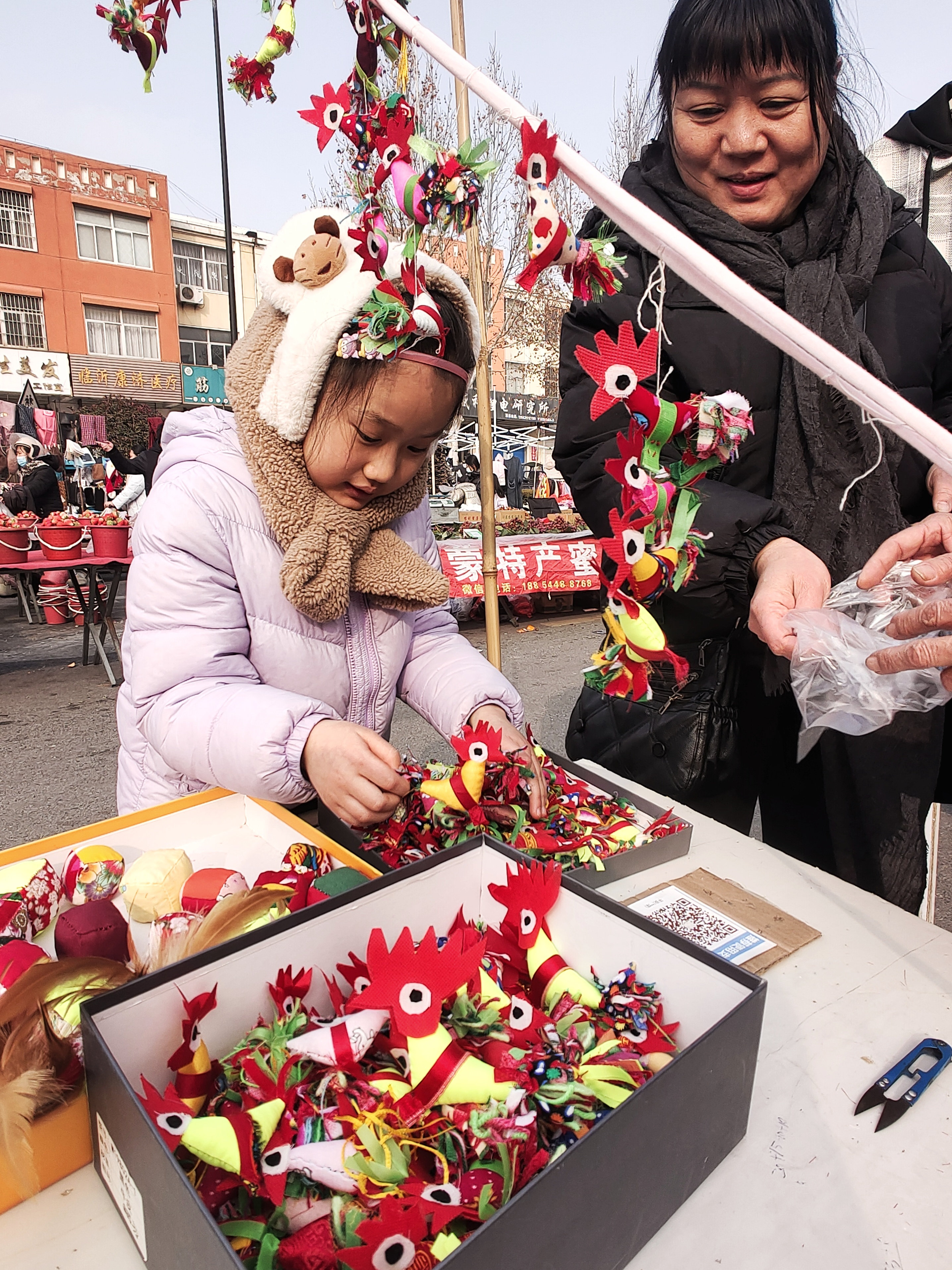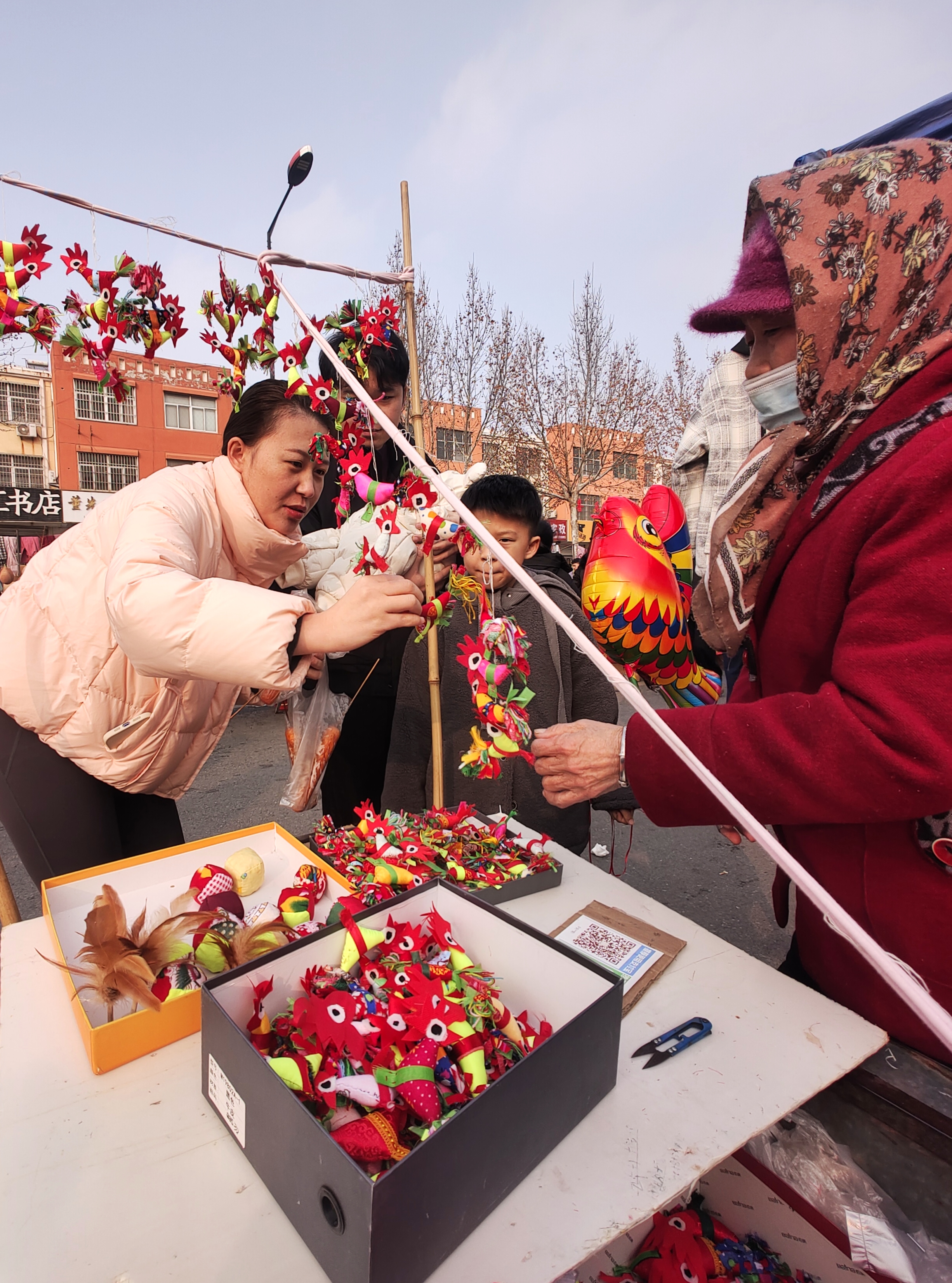 2月1日,农历腊月十四,立春前夕,临沂沂河新区埠前店迎来年中大集,集市上售卖“迎春鸡”的摊点格外引人注目。鲁南地区农村有立春时给小孩子佩戴“春鸡”的习俗。佩戴“春鸡”能够辟邪除灾、迎祥纳福,寄托着长辈对孩子健康成长的美好期许。集市上,一位埠前店老人骑着三轮车,带着亲手制作的“迎春鸡”赶来赶年集。“迎春鸡”5块钱一对,十分抢手,一会儿就卖出了五对。老人说自己卖“迎春鸡”已有十多年,每年都会缝制一些,赶在立春前出来售卖。这些“迎春鸡”由棉布和棉花组合缝制而成,个个神态活灵活现、栩栩如生。小孩佩戴“迎春鸡”寓意着大吉大利、健康平安。(高军摄影)