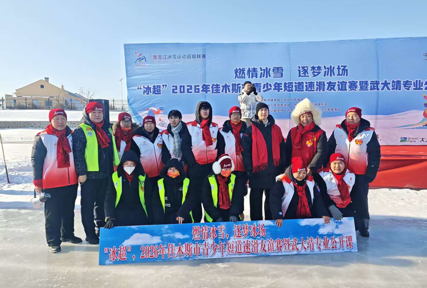 近日,黑龙江冰雪运动超级联赛“超级冰雪 逐梦冰场”——“冰超”2026年佳木斯市青少年短道速滑友谊赛暨武大靖专业公开课激情开赛。佳木斯市环境保护志愿者协会的“绿色身影”成为赛场别样风景。