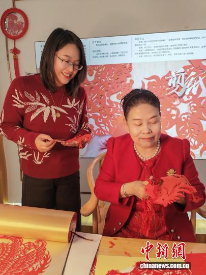 图为伏兆娥(右)和女儿一起剪纸。于晶摄