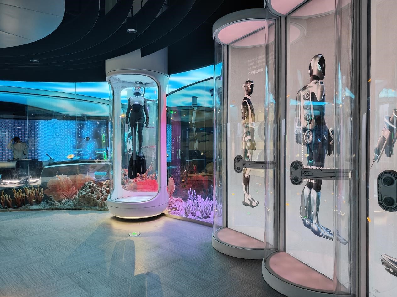 “深海空间站”模拟2125年的深海聚落形态,涵盖多个功能单元。其中,培育舱致力于实现食物生产与固碳的双重循环;能源舱构建“海水—氢能—电力”的闭环供能体系;总控舱依托人工智能系统开展生态监测与珊瑚修复工作;生物档案库则承担保存海洋生物基因信息的重要功能。